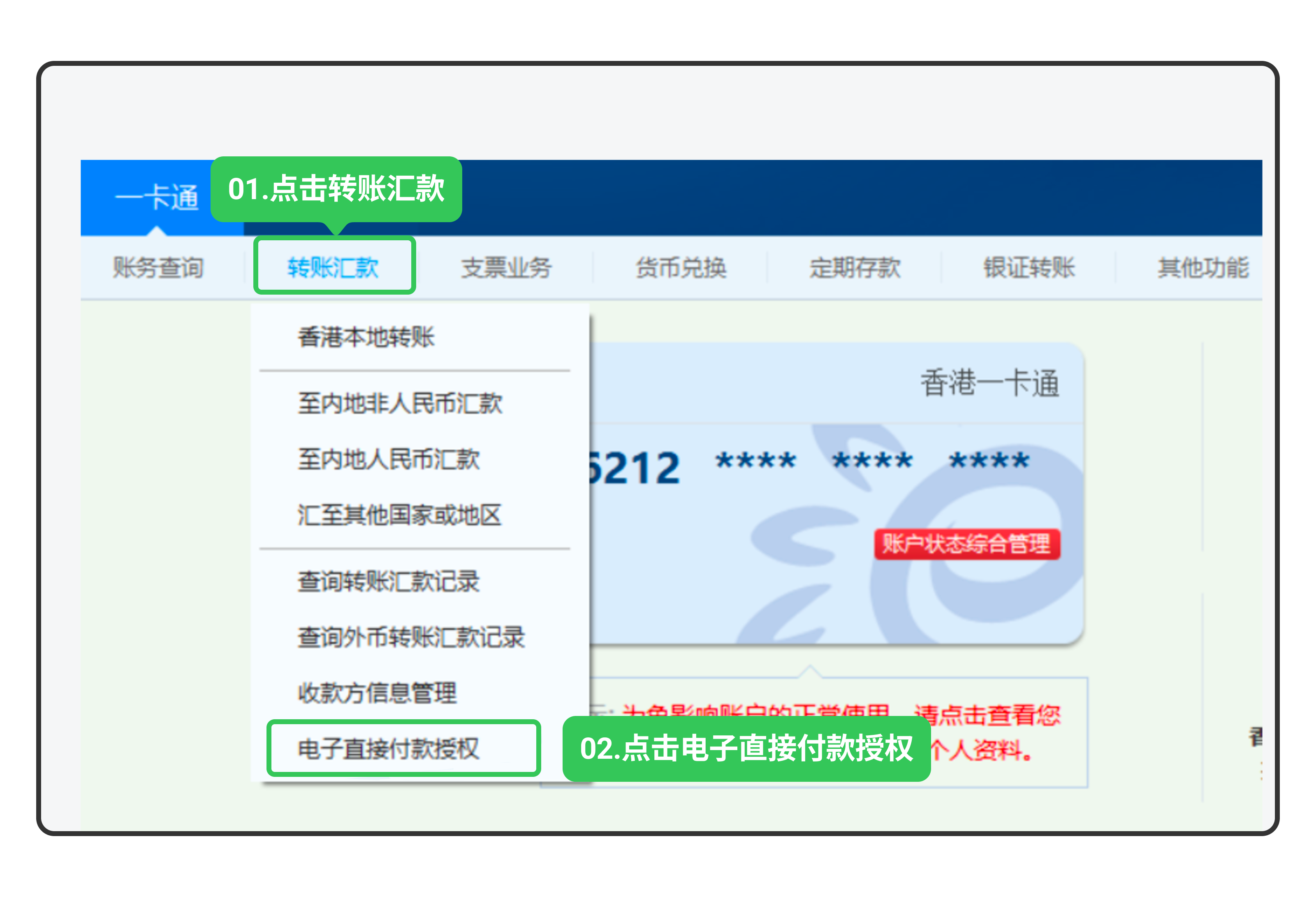 步骤 2.选择一卡通 > 转账汇款 > 电子直接付款授权。