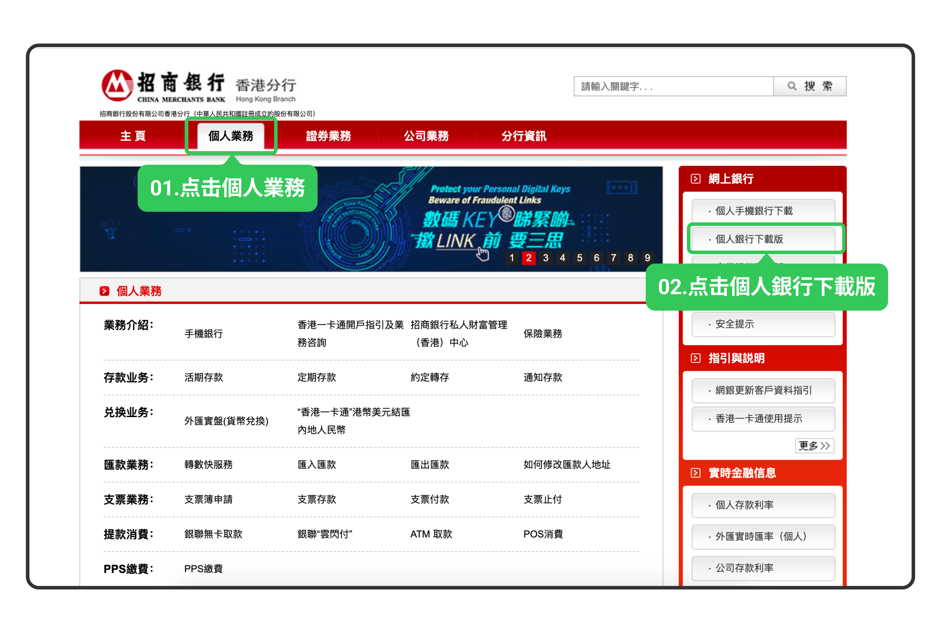 步骤 1.登录招商银行香港分行个人网上银行,选择 個人業務 > 個人銀行下載版,下载 PC 端应用,通过 个人银行香港专业版 进行登录 。