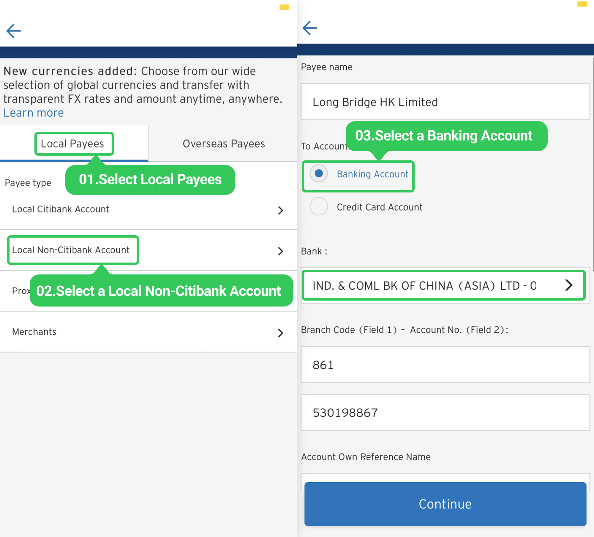 Step 3. On the Local Payees tab, choose Local Non-Citibank Account in the Payee type section, enter information on the following page, and click Continue.