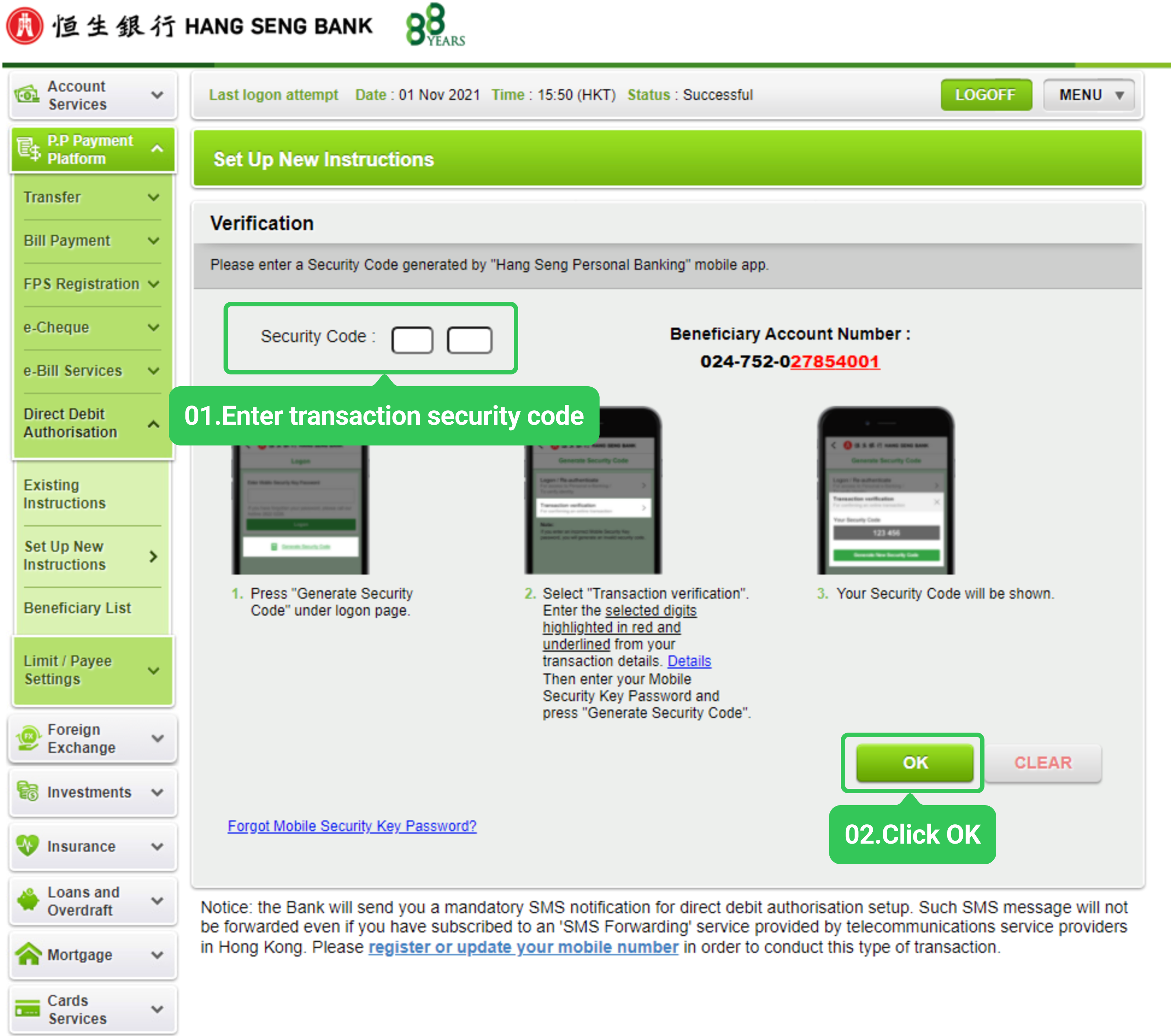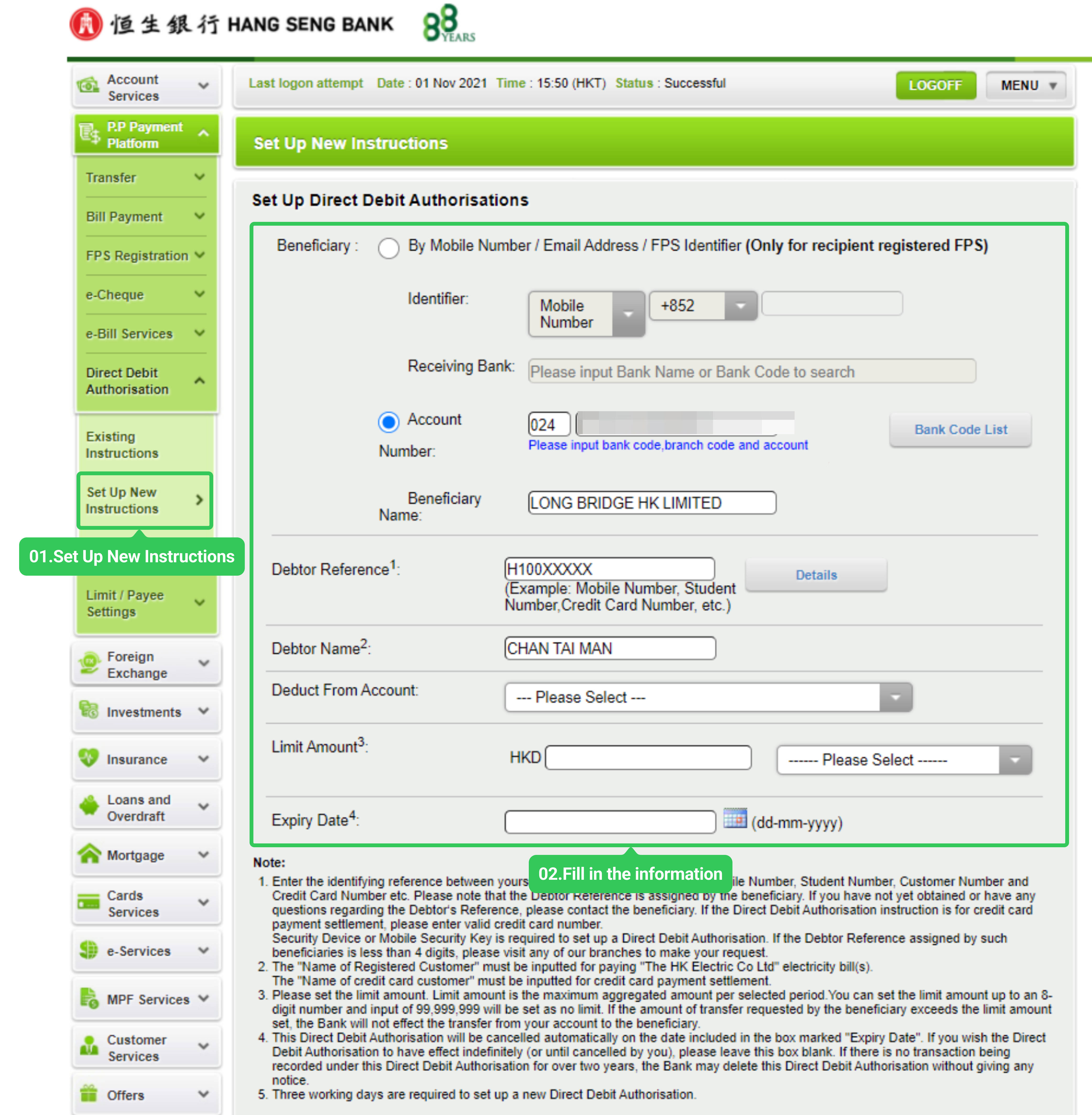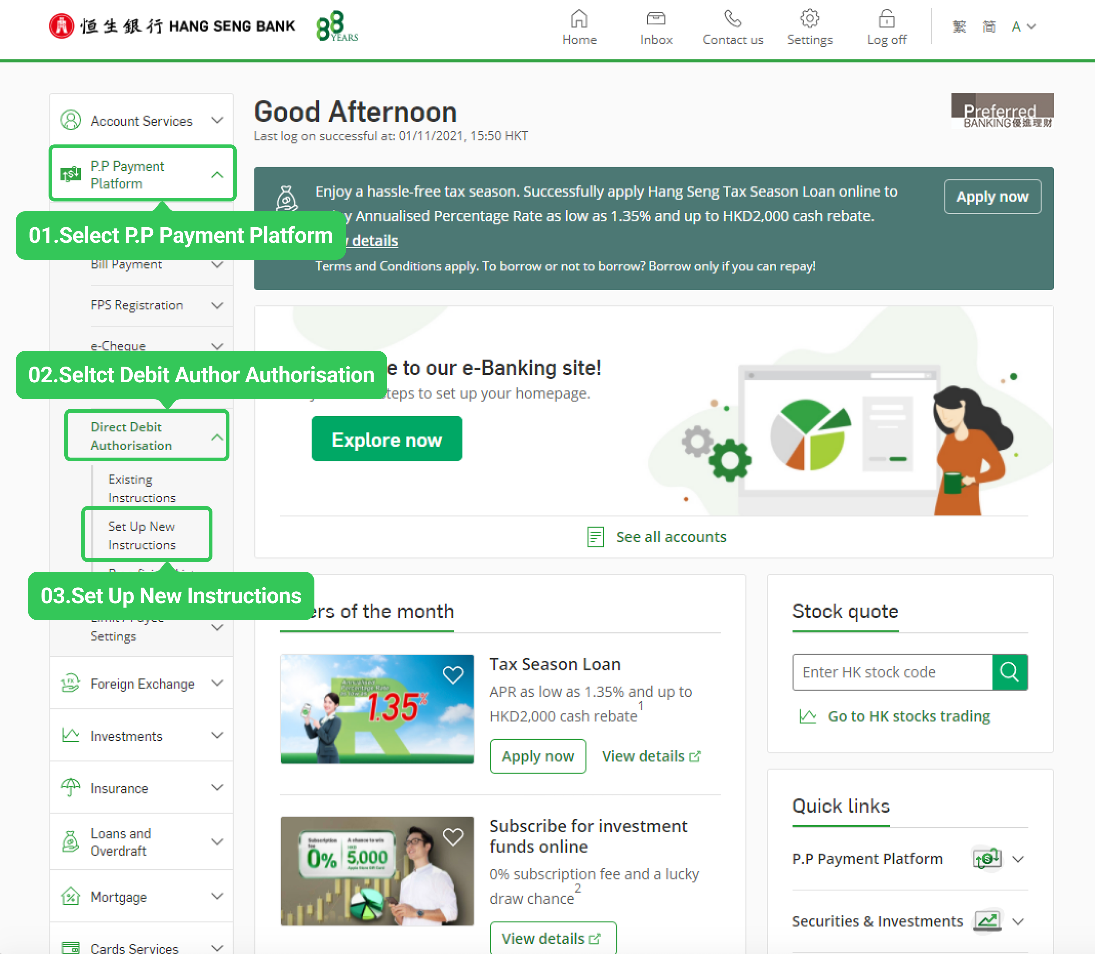 Step 1. Log in to Hang Seng Bank online banking and select P.P Payment Platform > Direct Debit Authorisation > Set Up New Instructions.