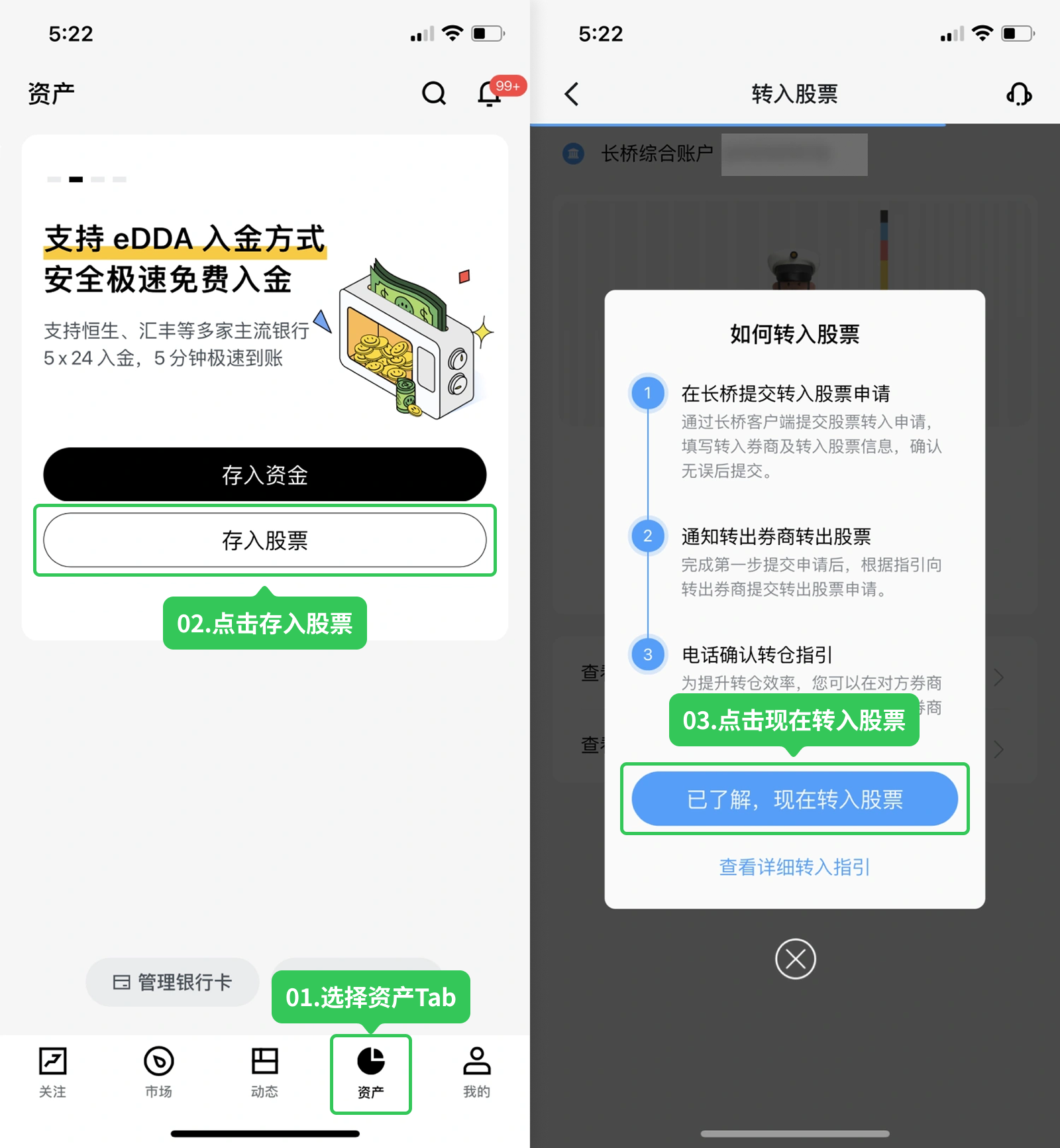 步骤 1. 打开长桥 App > 资产 > 存入股票 > 提交转入申请。如已入金,可进入资产 > 全部功能 > 转入股票。