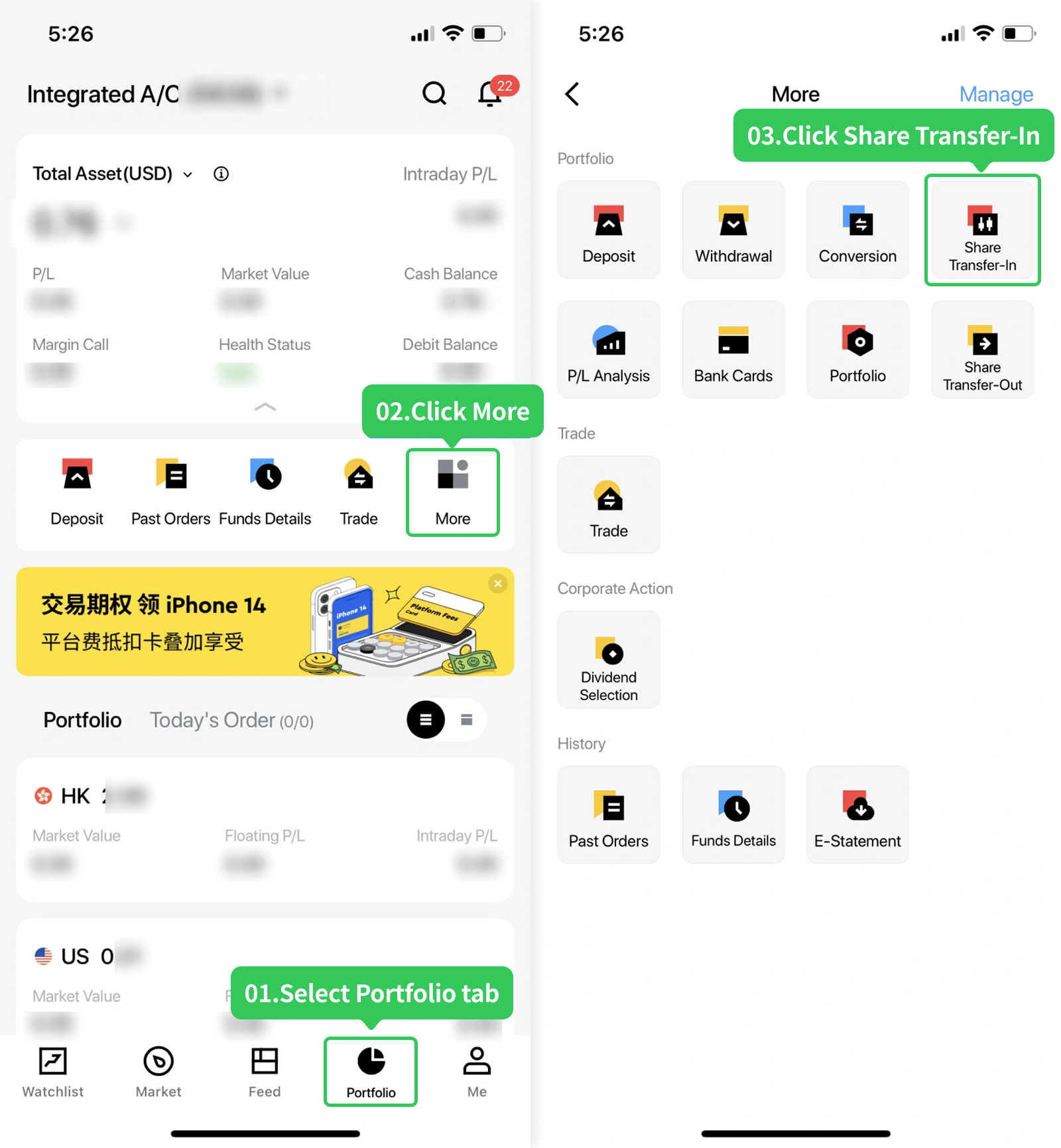 Step 1. Go to the Longbridge App > Portfolio > Transfer to submit a transfer-in application . If you have already deposited funds, select Portfolio > More > Share Transfer-In.