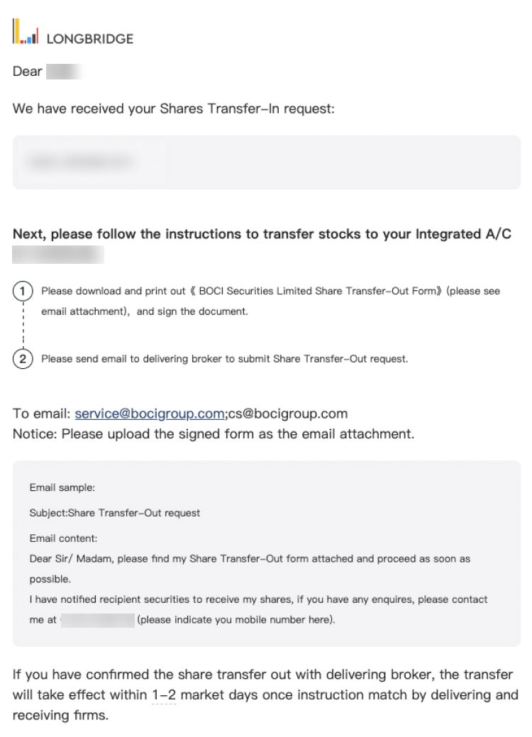 Recommended email content: Dear Sir/Madam, please find my share transfer-out form attached and proceed as soon as possible. I have notified Longbridge to receive my shares. If you have any questions, please contact me at 1XXXXXXXX (your mobile number).