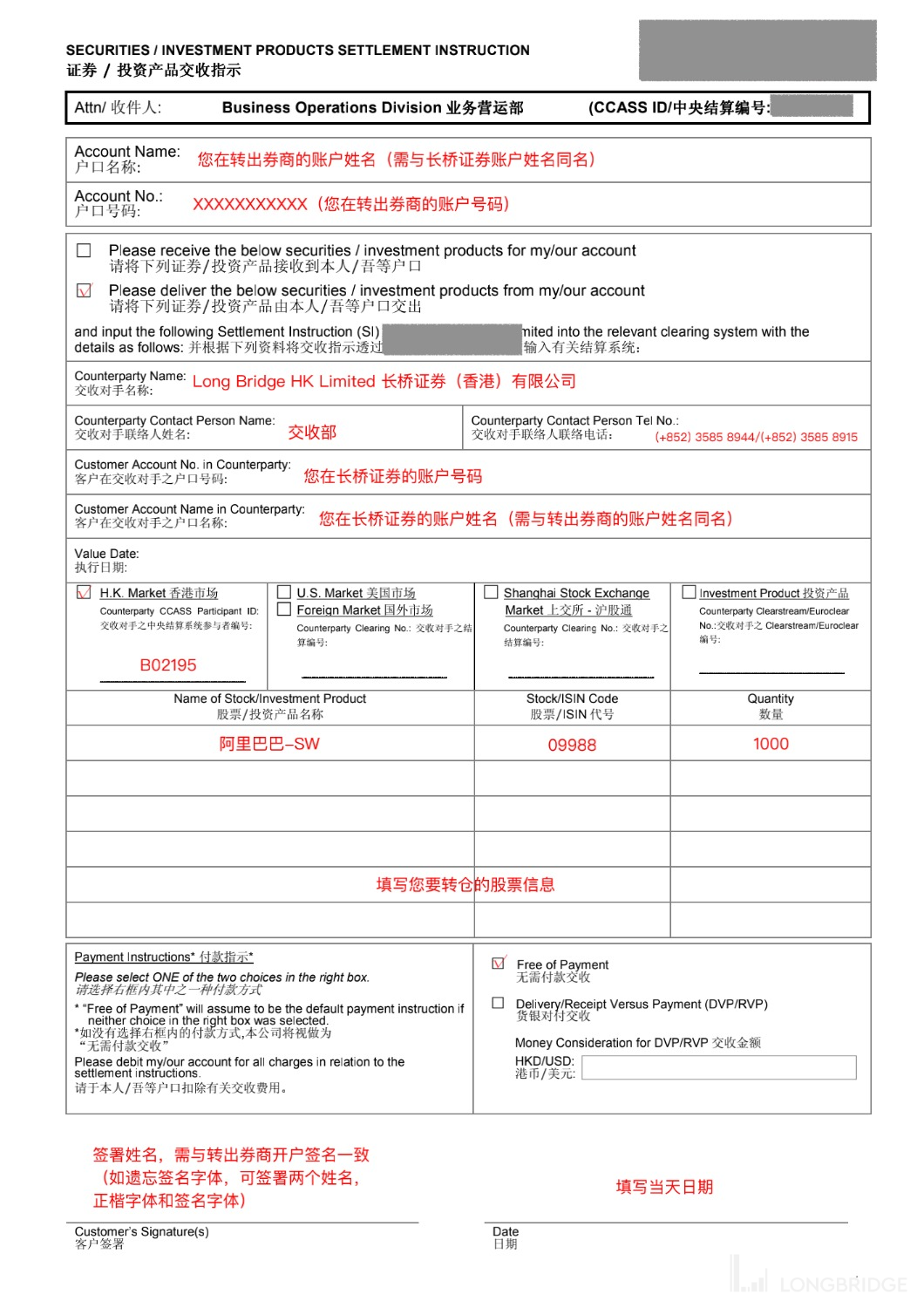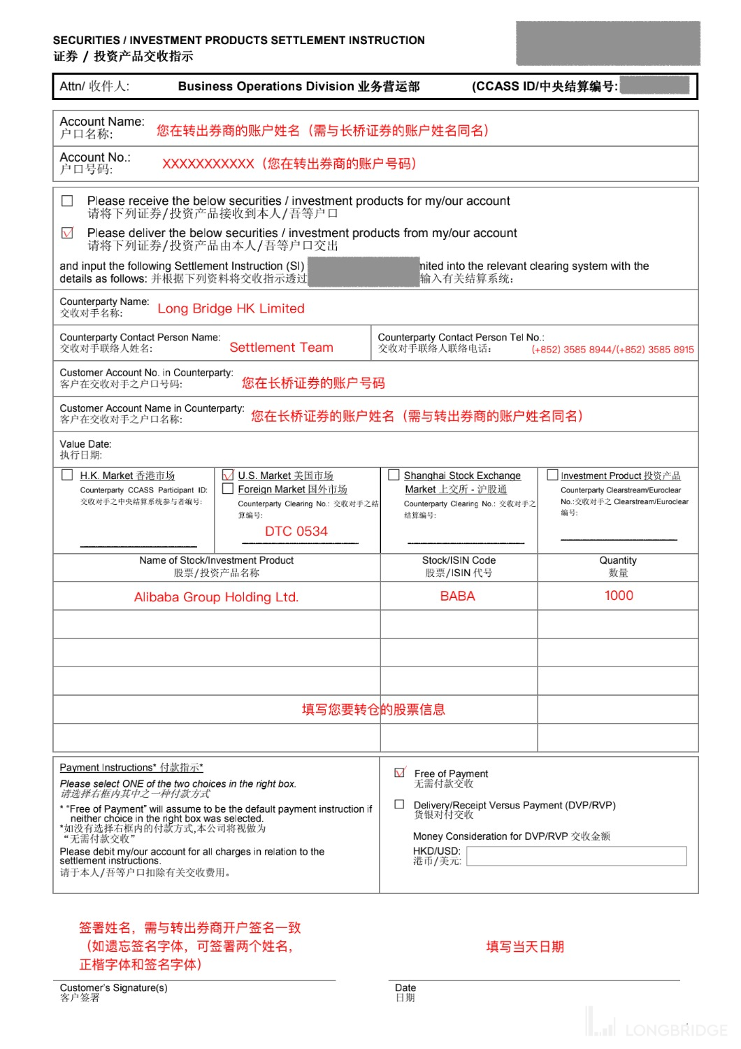 If you do not receive the transfer application form, you can contact BOCI to obtain the form and fill it in. The broker information and form filling example of Longbridge are as follows: